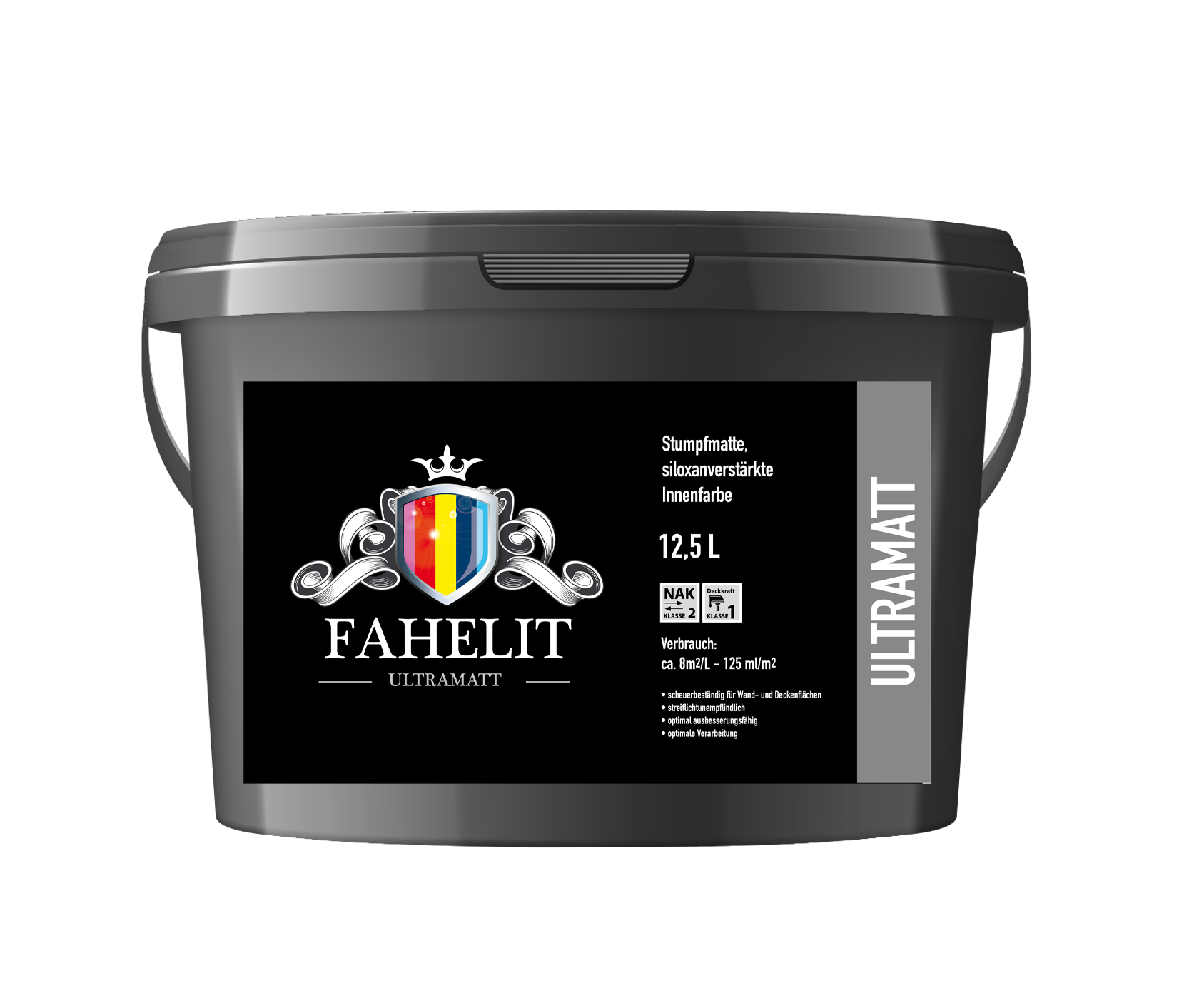 Verarbeitung: In der Regel einmal unverdünnt auftragen. Bei entsprechenden Untergründen und Werkzeugen bis max. 5% Wasser zugeben. FAHELIT ULTRA MATT kann gestrichen, gerollt und gespritzt werden. Zur Vermeidung von Ansätzen nass-in-nass in einem Zug beschichten. Geeignet für Airless-Spritzauftrag (Düsendurchmesser mind. 0,5 mm). Material-, Umluft- und Untergrundtemperatur mind. +5 °C. Erhältlich in 1 Ltr. / 2.5Ltr. 5 Ltr. / 12,5 Ltr.